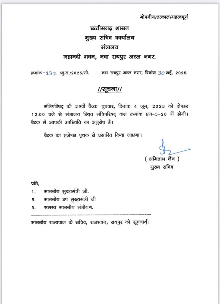 रायपुर। साय मंत्रिपरिषद की बैठक 4 जून को दोपहर 12 बजे से मंत्रालय में होगी. साय मंत्रिपरिषद की इस 29वीं बैठक का एजेंडा फिलहाल सार्वजनिक नहीं किया गया है, लेकिन कयास लगाए जा रहे हैं कि मानसून के आगमन के साथ खेती-किसानी की समस्याओं पर चर्चा करते हुए निर्णय लिए जाएंगे.