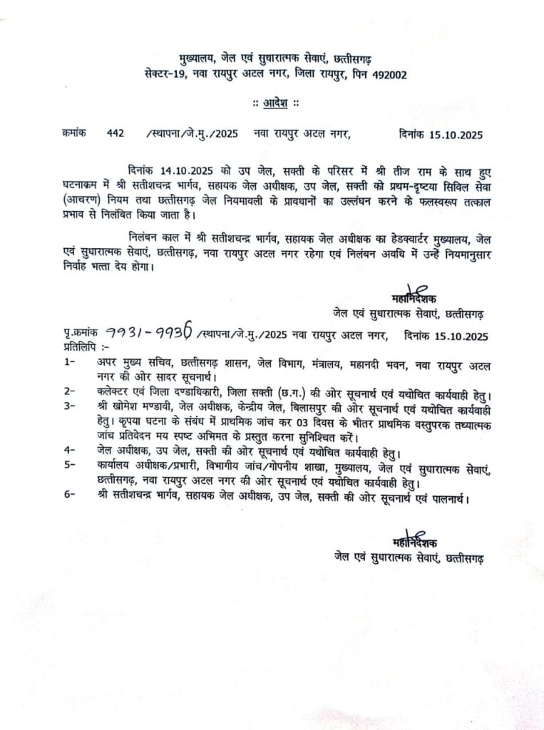 आदेश में बताया गया है कि प्रथम दृष्टया सतीश चंद्र भार्गव के खिलाफ सिविल सेवा आचरण नियमों का उल्लंघन पाए जाने पर यह कार्रवाई की गई है। सतीश चंद्र भार्गव को निलंबित करते हुए रायपुर स्थित जेल एवं सुधारक सेवाएं महानिदेशक कार्यालय में अटैच किया गया है।