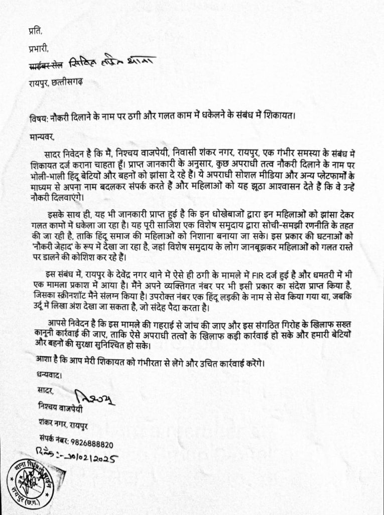 रायपुर। राजधानी रायपुर में एक गंभीर मामला सामने आया है, जिसमें नौकरी दिलाने के नाम पर लड़कियों को फंसाने और गलत कामों में धकेलने का आरोप है. इस मामले में भाजपा नेता निश्चय वाजपेयी ने पुलिस से शिकायत करते हुए एक संगठित गिरोह के खिलाफ जांच की मांग की है, जो खासतौर पर हिंदू लड़कियों को निशाना बना रहा है. उन्होंने इस मामले में सिविल लाइन थाना और एसएसपी से शिकायत की है. साथ ही इससे जुड़े व्हाट्सएप मैसेज का स्क्रीनशॉट और अन्य जानकारी भी पुलिस को सौंपी है.