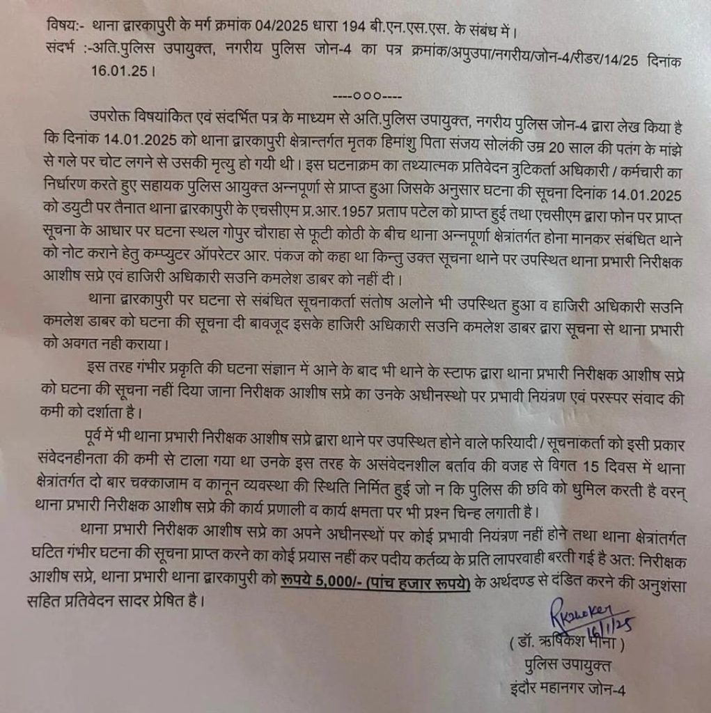 हेमंत शर्मा, इंदौर। मध्य प्रदेश के इंदौर में चाइनीज मांझे से छात्र की मौत के मामले में लापरवाही बरतने पर डीसीपी ने टीआई पर पांच हजार रुपए का जुर्माना लगाया है। संभवत: यह पहला मामला है जब संबंधित थाने के कर्मचारियों पर अर्थदंड की कार्रवाई की गई है। बता दें, कि मकर संक्रांति मंगलवार को शहर के फूटी कोठी चौराहे पर मांझे की डोर से एक छात्र की मौत हो गई। इस मामले में बुधवार को पोस्टमार्टम के बाद परिजन ने चाइनीज मांझे का जिक्र बयान में नहीं करने को लेकर शव को थाने के बाहर रखकर प्रदर्शन किया था।