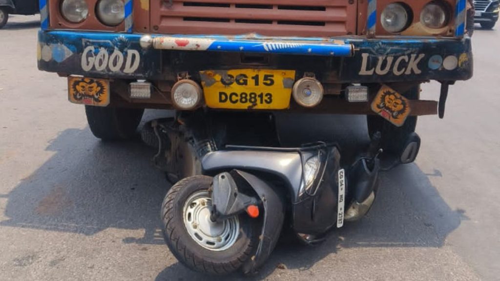 शिवम मिश्रा, रायपुर। राजधानी रायपुर के तेलीबांधा रिंग रोड पर आज सुबह एक दर्दनाक सड़क हादसा हो गया. एक ट्रक ने स्कूटी सवार 27 साल की युवती को रौंद दिया, जिससे उसकी की मौत हो गई. इस घटना के बाद नेशनल हाइवे काफी देर तक जाम रही. मौके पर पहुंची पुलिस ने मर्ग कायम कर शव को पोस्टमॉर्टम के लिए भेज दिया और वाहन चालक को भी गिरफ्तार कर लिया है. इस पूरी घटना का CCTV फुटेज भी अब सामने आ चुका है.