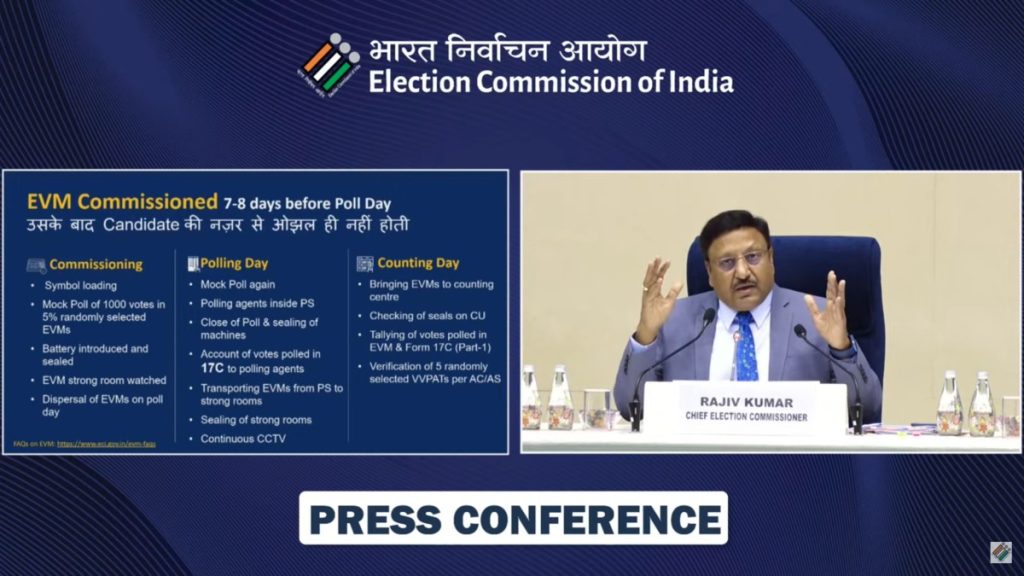 मुख्य चुनाव आयुक्त ने कहा कि चुनाव से सात से आठ दिन पहले EVM तैयार हो जाता है। EVM चुनाव का सबसे सुरक्षित तरीका है। गिनती से पहले हर EVM की सील चेक होती है। सुप्रीम कोर्ट ने भी माना है इसे हैक नहीं किया जा सकता है।