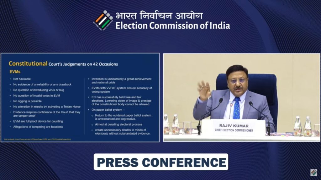 शायरी कहते हुए CEC ने एक बार फिर दोहराया कि ईवीएम (EVM) को हैक नहीं किया जा सकता है। उन्होंने कहा कि ईवीएम फुलप्रूफ डिवाइस है। इसे मतदान के बाद सील कर दिया जाता है और इसमें वायरस नहीं जा सकता है। साथ ही मुख्य चुनाव आयुक्त राजीव कुमार ने कहा कि ईवीएम में अवैध वोट डालने की संभावना नहीं है।
