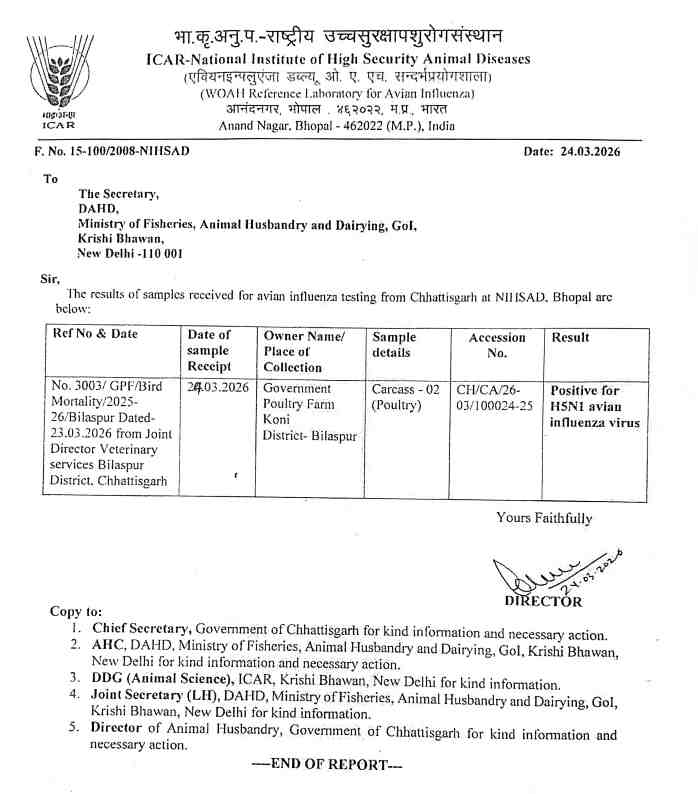 शासकीय कुक्कुट पालन प्रक्षेत्र कोनी बिलासपुर से बर्ड फ्लू का मामला सामने आया है, वहां प्रक्षेत्र के पक्षियों और अन्य उत्पादों दाना,अंडा, बोरी इत्यादि के विनिष्टीकरण के लिए 9 सदस्यीय कमेटी बनाई गई है, जिसमें डॉक्टर आरके गुप्ता नोडल अधिकारी होंगे। इसके अलावा कोनी के एक किलोमीटर के क्षेत्र को इनफेक्टेड जोन और आसपास के दस किलोमीटर के एरिया को सर्विलांस जोन घोषित किया गया है। संक्रमण क्षेत्र में पाए गए एक किलोमीटर की परिधि को संक्रमित क्षेत्र एवं 10 किलोमीटर के क्षेत्र को सर्विलांस क्षेत्र में मैपिंग कर स्थानीय भाषा में साइन बोर्ड लगाने के निर्देश दिए गए हैं।