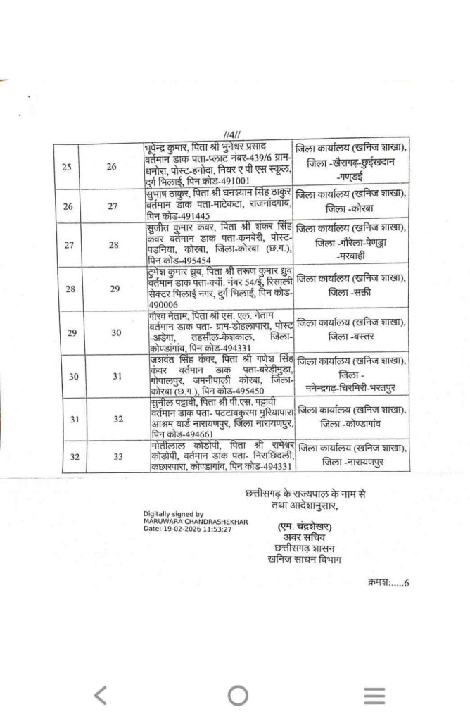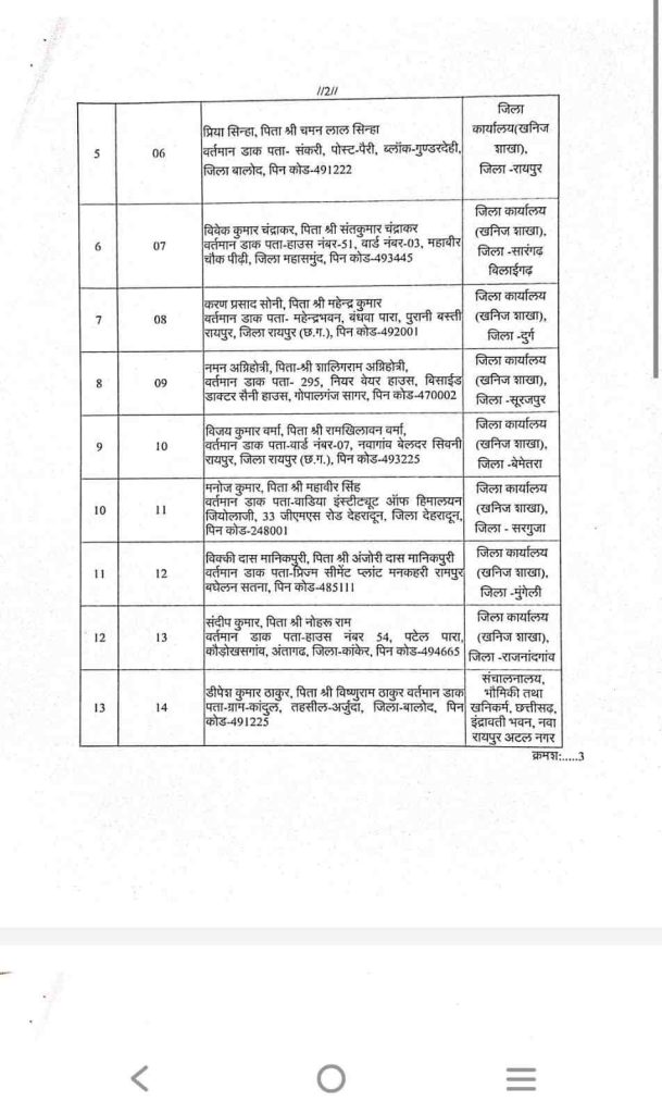 रायपुर। छत्तीसगढ़ शासन के खनिज साधन विभाग ने खनिज निरीक्षक (वेतन मैट्रिक्स लेवल-7) पद पर चयनित अभ्यर्थियों की नियुक्ति का आदेश जारी कर दिया है। यह नियुक्ति छत्तीसगढ़ लोक सेवा आयोग की ओर से आयोजित लिखित परीक्षा एवं साक्षात्कार के परिणाम के आधार पर की गई है।
