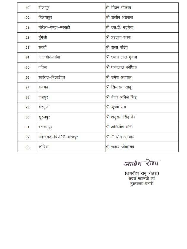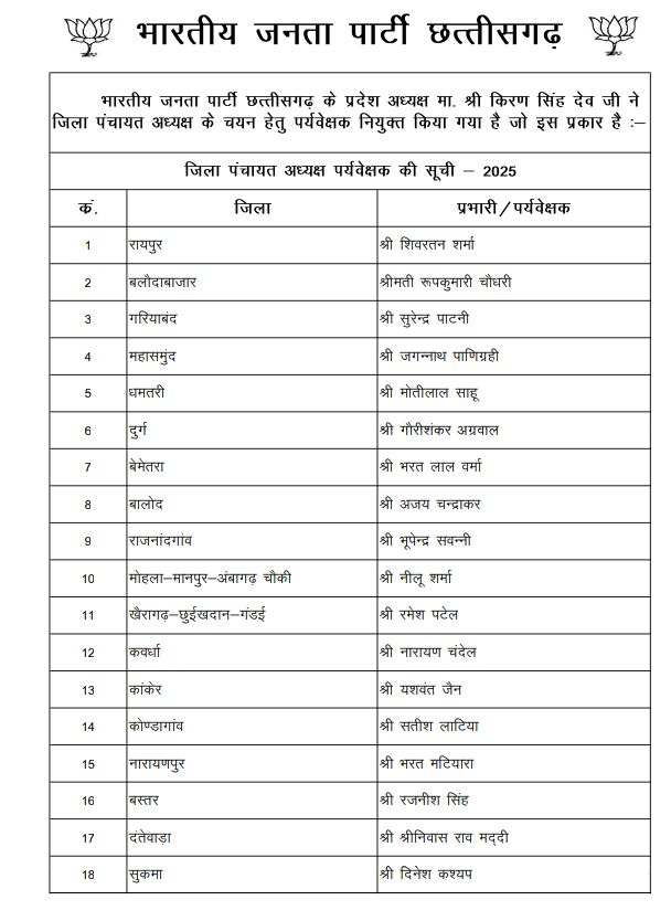 रायपुर. भाजपा प्रदेश अध्यक्ष किरण सिंह देव ने जिला पंचायत अध्यक्ष के चयन के लिए सभी 33 जिलों में पर्यवेक्षकों की नियुक्ति की है। रायपुर में शिवरतन शर्मा, दुर्ग में गौरीशंकर अग्रवाल, धमतरी में मोतीलाल साहू, कवर्धा में नारायण चंदेल को जिम्मेदारी दी गई है।