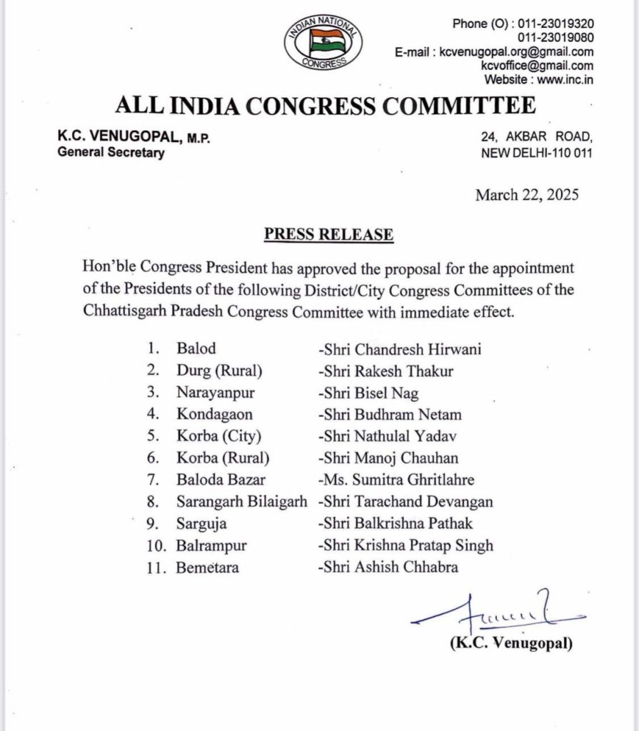 AICC से जारी आदेश के मुताबिक, बालोद में चंद्रेश हिरवानी, दुर्ग (ग्रामीण) राकेश ठाकुर, नारायणपुर में बिसेल नाग, कोंडागांव में बुधराम नेताम, कोरबा (शहर) नाथूलाल यादव, कोरबा (ग्रामीण) मनोज चौहान, बलौदाबाजार में सुमित्रा घृतलहरे, सारंगढ़-बिलागढ़ में ताराचंद देवांगन, सरगुजा में बालकृष्ण पाठक, बलरामपुर में कृष्ण प्रताप सिंह और बेमेतरा में आशीष छाबड़ा अध्यक्ष बनाए गए हैं.