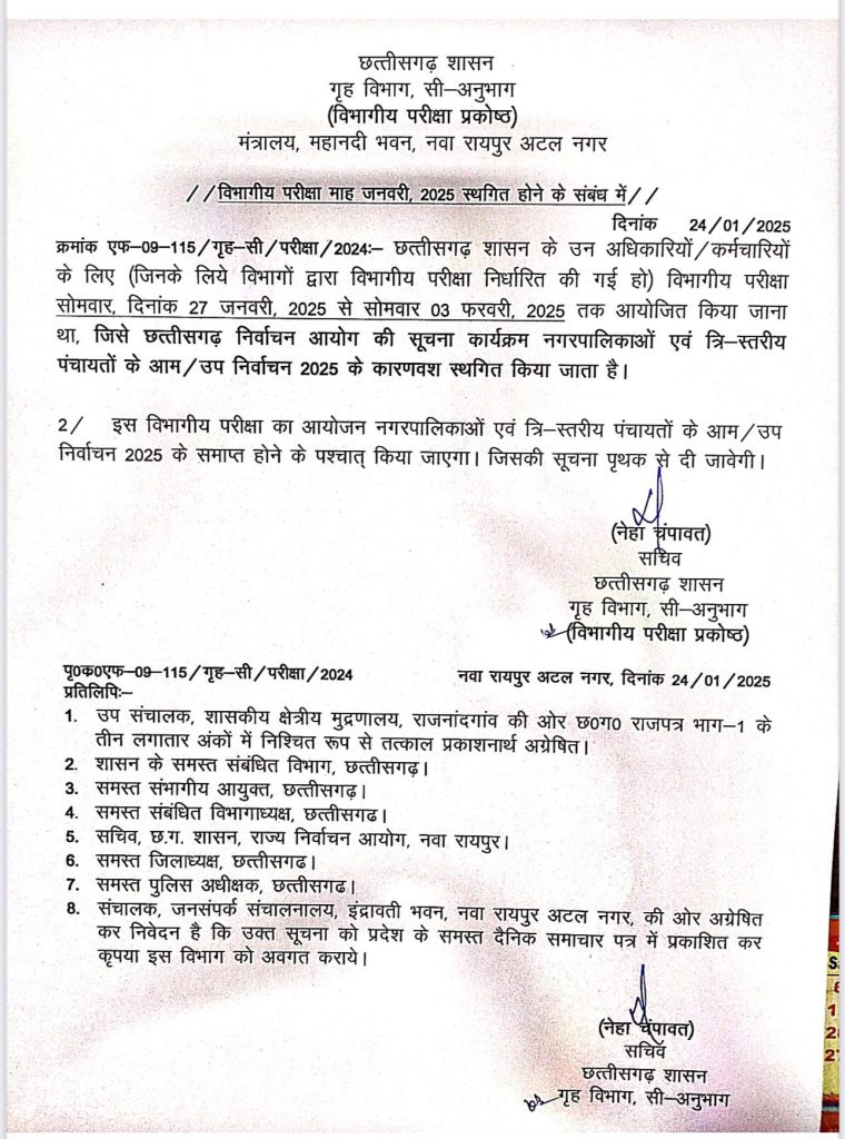 सत्या राजपूत, रायपुर। छत्तीसगढ़ शासन द्वारा आयोजित की जाने वाली विभागीय परीक्षा नगरपालिकाओं और त्रि-स्तरीय पंचायतों के चुनाव 2025 के कारणवश स्थगित की गई है. इस संबंध में गृह विभाग विभागीय परीक्षा प्रकोष्ठ मंत्रालय से आदेश जारी हुआ है.