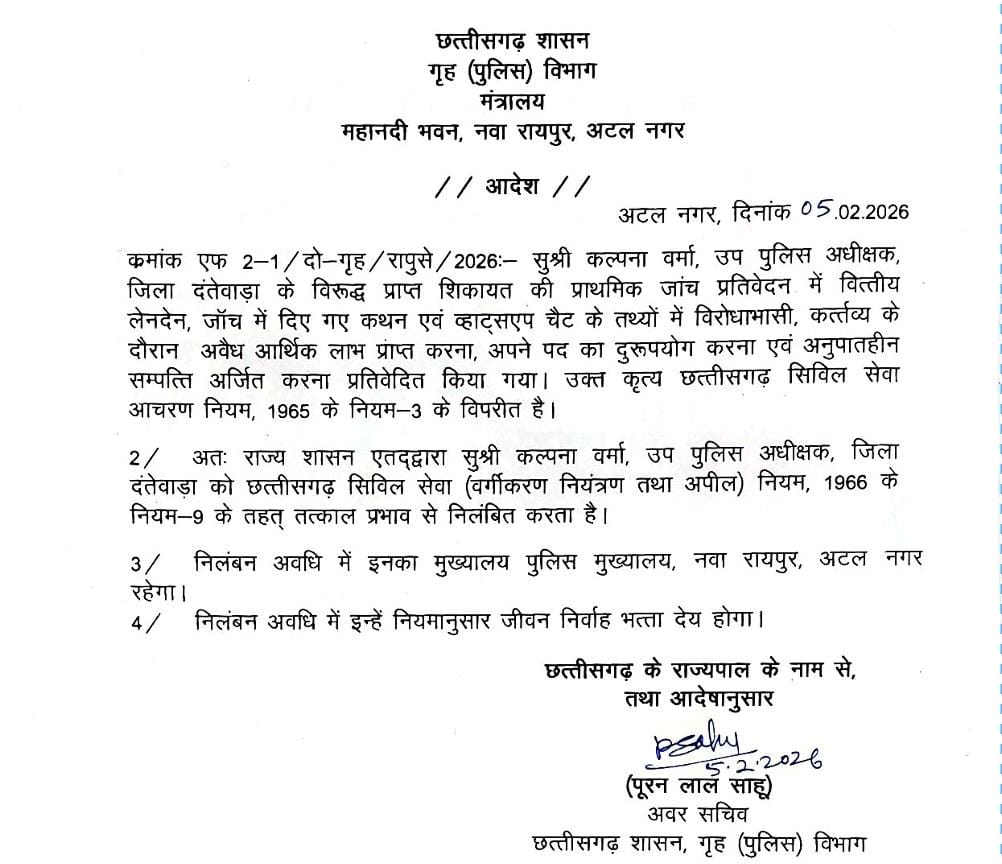 यह कृत्य छत्तीसगढ़ सिविल सेवा आचरण नियम, 1965 के नियम-3 के विपरीत है। जिसे देखते हुए उन्हें निलंबित कर दिया गया है। निलंबन अवधि में कल्पना वर्मा का मुख्यालय पुलिस मुख्यालय, नवा रायपुर रहेगा और उन्हें नियमानुसार जीवन निर्वाह भत्ता प्रदान किया जाएगा।