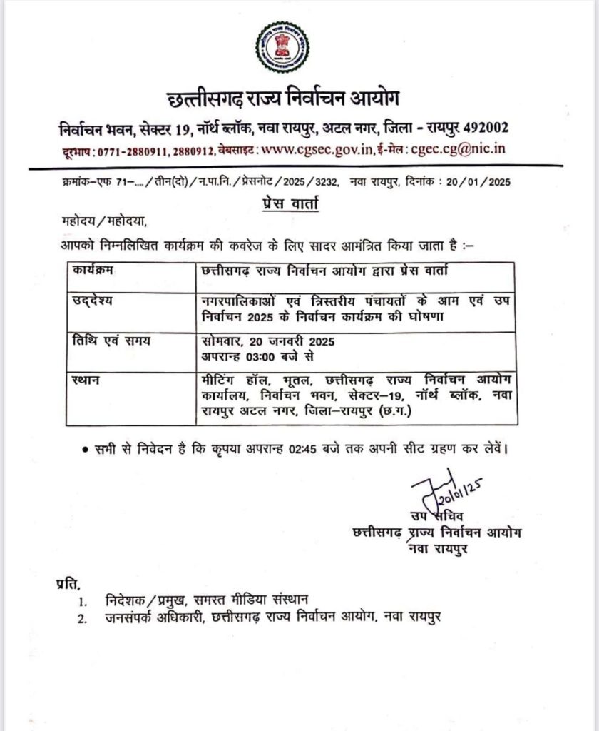 रायपुर. छत्तीसगढ़ में आगामी नगरीय निकाय और पंचायत चुनाव को लेकर आज दोपहर 3 बजे छत्तीसगढ़ निर्वाचन आयोग प्रेस वार्ता करने जा रही है. इस वार्ता में निर्वाचन आयोग के अधिकारी चुनाव की तारीखों समेत तमाम जानकारी साझा करेंगे. वहीं चुनाव तारीखों की घोषणा के साथ ही आचार संहिता लागू हो जाएगी. बता दें, 18 जनवरी को मतदाता सूची का अंतिम प्रकाशन किया गया था. जानकारी के मुताबिक, फरवरी के अंत तक दोनों चुनाव पूरे होने की संभावना है.