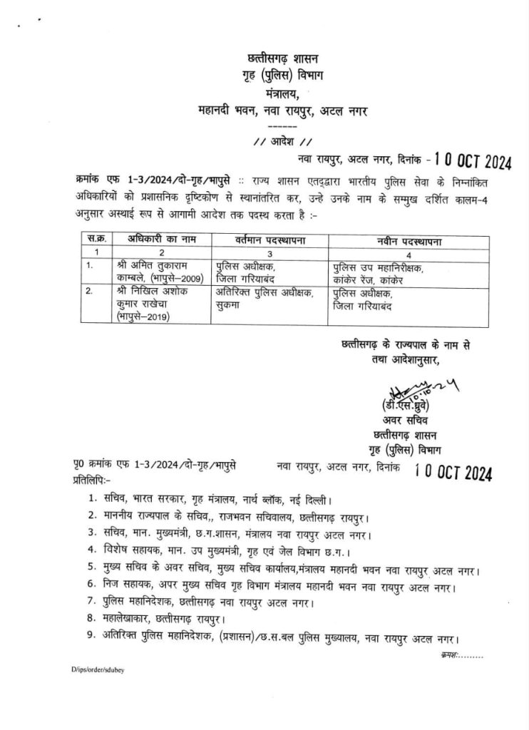 बता दें कि 2009 बैच के आईपीएस अधिकारी अमित कांबले डीआईजी प्रमोशन के बाद भी गरियाबंद जिले का प्रभार संभाल रहे थे। वहीं निखिल राखेचा सुकमा एसपी की जिम्मेदारी संभाल रहे थे।