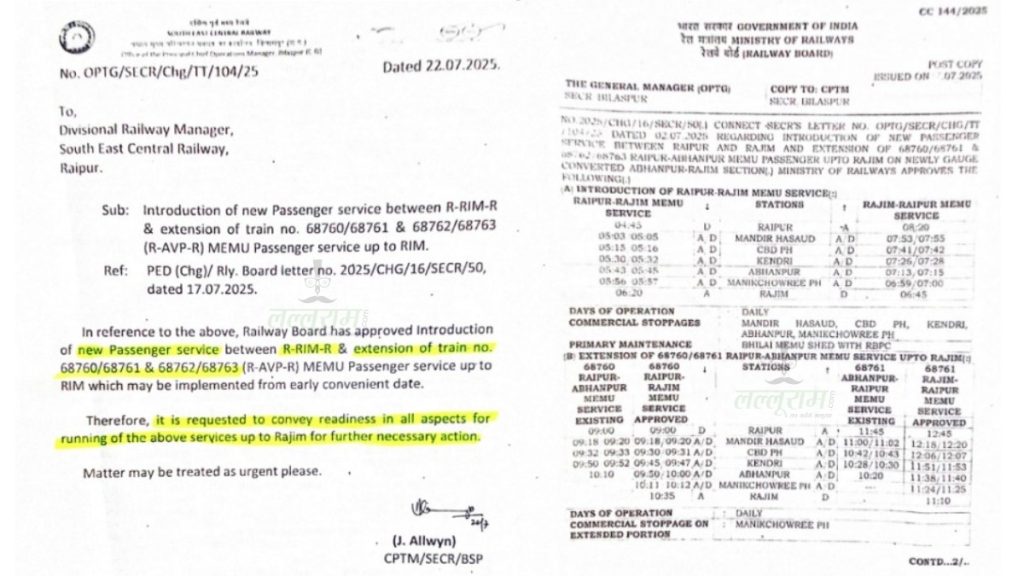 CG Breaking News: प्रतीक चौहान. छत्तीसगढ़ के प्रयागराज यानी राजिम तक लोकल ट्रेन मिलने की हरी झंडी रेल मंत्रालय से रायपुर रेल मंडल को मिल गई है. अब कभी भी रायपुर-अभनपुर ट्रेन को राजिम तक शुरू किया जा सकता है. (Raipur to Rajim New Train)