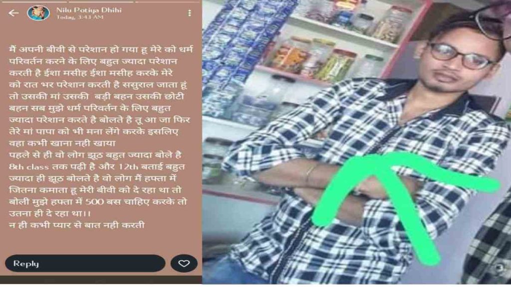 अभिषेक मिश्रा, धमतरी. छत्तीसगढ़ के धमतरी जिले में एक युवक ने फांसी लगाकर आत्महत्या कर ली. सुसाइड से पहले युवक लिनेश साहू ने पहले अपना व्हाट्सएप स्टेटस अपडेट किया, फिर फांसी लगा ली. स्टेटस में पत्नी और ससुराल पक्ष द्वारा धर्मांतरण के लिए दबाव डालने का आरोप लगाया गया है. यह मामला पोटियाडीह गांव का है.