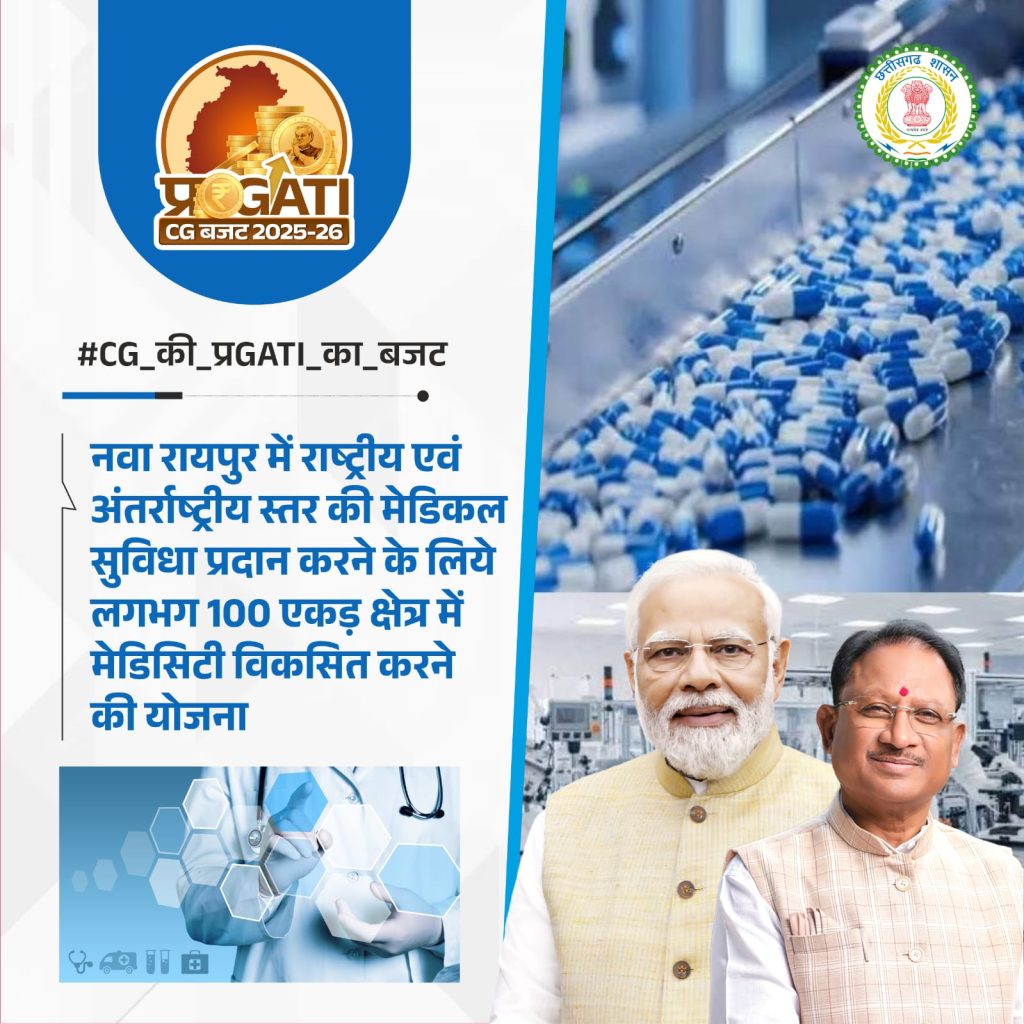 वहीं बजट में मेडिसिटी बनाने की भी घोषणा की गई है. यह परियोजना राष्ट्रीय और अंतरराष्ट्रीय स्तर की चिकित्सा सुविधाएं प्रदान करेगी, जिससे राज्य के लोगों को बेहतरीन स्वास्थ्य सेवाएं उपलब्ध होंगी. इसके तैयार होने से छत्तीसगढ़ में हेल्थ सुविधाओं में वृद्धि होगी. मेडिसिटी की स्थापना से नवा रायपुर अटल नगर में प्रदेश वासियों को एक ही स्थान पर अच्छी स्वास्थ्य सुविधाएं उपलब्ध हो सकेगी.