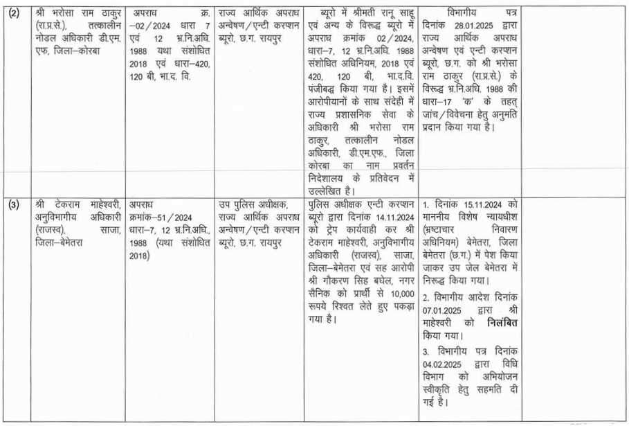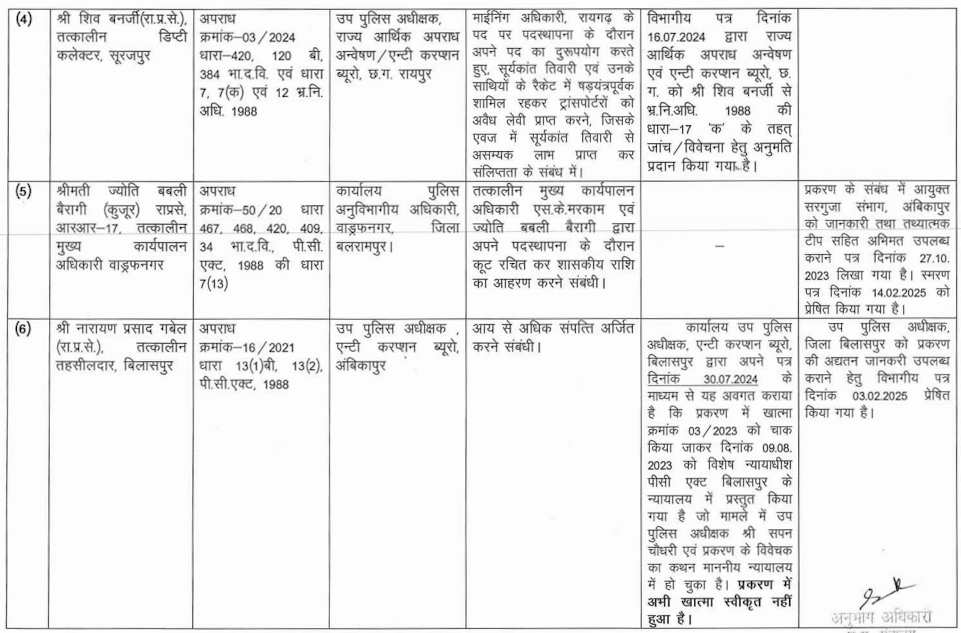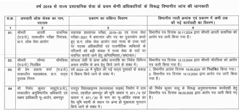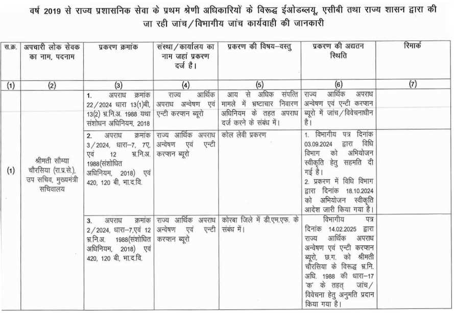विधानसभा बजट सत्र के दूसरे दिन भाजपा विधायक धरमलाल कौशिक ने सवाल किया कि राज्य प्रशासनिक सेवा के कितने अधिकारियों के खिलाफ किन-किन मामलों में और कब एसीबी और ईओडब्ल्यू में अपराध दर्ज है? विभागीय जाँच किन-किन के खिलाफ हो रहा है?