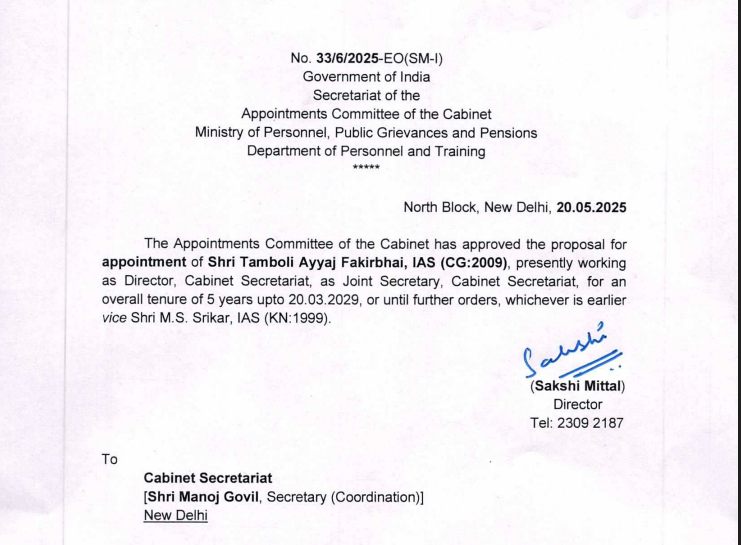 रायपुर। भारत सरकार ने कैबिनेट सचिवालय में एक महत्वपूर्ण प्रशासनिक नियुक्ति करते हुए छत्तीसगढ़ कैडर के आईएएस अधिकारी अय्याज फकीरभाई तंबोली (बैच 2009) को संयुक्त सचिव (Joint Secretary) नियुक्त किया है। वर्तमान में वह कैबिनेट सचिवालय में निदेशक के पद पर कार्यरत हैं।