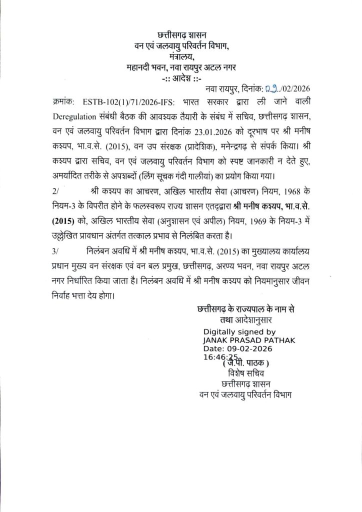 रायपुर। छत्तीसगढ़ शासन के वन एवं जलवायु परिवर्तन विभाग के सचिव के साथ अमर्यादित और अभद्र भाषा का प्रयोग करना भारतीय वन सेवा (IFS) के अधिकारी मनीष कश्यप को भारी पड़ गया। राज्य सरकार ने उनके इस आचरण को गंभीर अनुशासनहीनता मानते हुए उन्हें तत्काल प्रभाव से निलंबित कर दिया है।