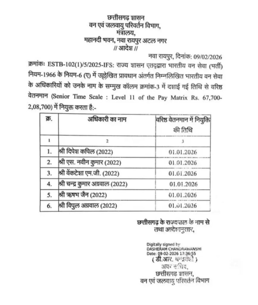 वन एवं जलवायु परिवर्तन विभाग ने इस संबंध में आदेश जारी किया है। जारी आदेश के अनुसार, वर्ष 2022 बैच के 6 आईएफएस अधिकारियों को यह पदोन्नति दी गई है। पदोन्नत अधिकारियों में दीपेश कपिल, एस नवीन कुमार, वेंकटेश एमजी, चंद्र कुमार अग्रवाल, ऋषभ जैन, विपुल अग्रवाल शामिल हैं।