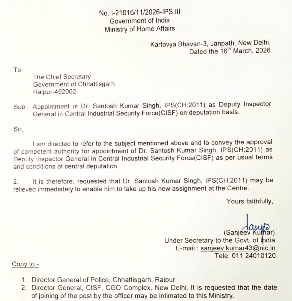 मिनिस्ट्री ऑफ होम अफेयर्स ने आईपीएस संतोष सिंह की डेपुटेशन को मंजूरी देते हुए इसके आदेश जारी कर दिए हैं। अंडर सेक्रेटरी संजीव कुमार ने इसके आदेश जारी किए हैं। छत्तीसगढ़ के मुख्य सचिव को भेजे गए पत्र में उन्होंने आईपीएस सिंह को तत्काल नई जिम्मेदारी पर ज्वाइन करने के लिए रिलीव करने को कहा हैं।