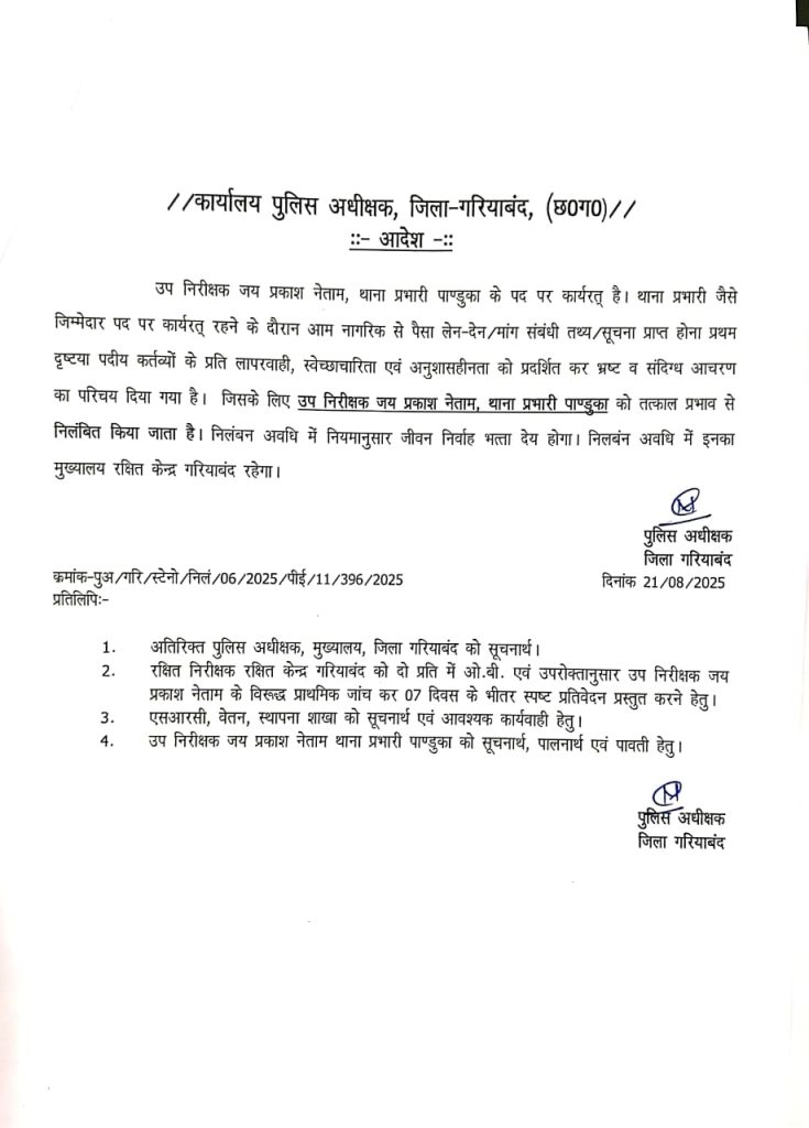 गरियाबंद। छत्तीसगढ़ के गरियाबंद जिले में पुलिस अधीक्षक निखिल राखेचा ने बड़ी प्रशासनिक कार्रवाई करते हुए पाण्डुका थाना प्रभारी जय प्रकाश नेताम को निलंबित कर दिया है. थाना प्रभारी पर आम लोगों से पैसों की वसूली करने समेत अपने ड्यूटी में गंभीर लापरवाही और अनुशासनहीनता के आरोप लगे हैं.