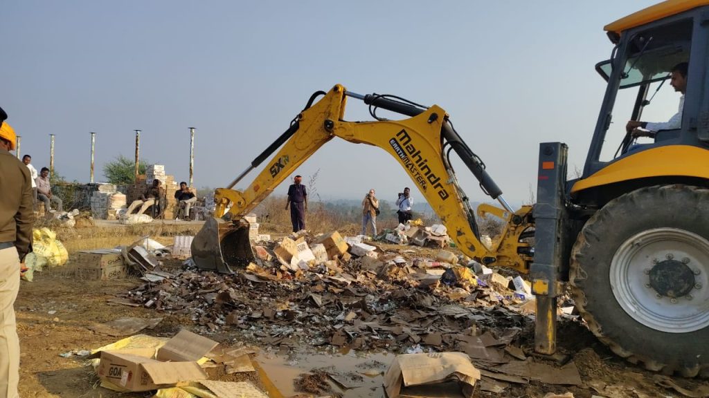 एमसीबी. जिले के ग्राम चैनपुर में आज छत्तीसगढ़ आबकारी अधिनियम 1915 की धारा 34 (2) के तहत विभिन्न प्रकरणों में जब्त किए गए शराब को नष्ट किया गया है. इस दौरान 10985.57 लीटर जब्त मदिरा पर बुलडोजर चलाया गया. कलेक्टर डी. राहुल वेंकट के आदेश के परिपालन में गठित समिति के सदस्य, पत्रकार और वीडियोग्राफर मौके पर मौजूद रहे.