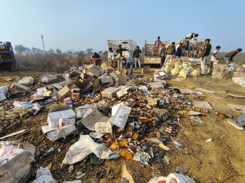 थानावार केल्हारी से 5 प्रकरणों में 31 लीटर, झगराखांड़ से 28 प्रकरणों में 924.425 लीटर, कोटाडोल से 2 प्रकरणों में 13.86 लीटर, जनकपुर से 6 प्रकरणों में 97.84 लीटर, चिरमिरी से 36 प्रकरणों में 564.25 लीटर, खड़गवां से 59 प्रकरणों में 2828.82 लीटर, मनेंद्रगढ़ से 64 प्रकरणों में 3435.00 लीटर तथा पोंड़ी से 14 प्रकरणों में 3090.37 लीटर कुल 10985.57 लीटर मदिरा का नष्टीकरण किया गया. वहीं नष्टीकरण की प्रक्रिया के दौरान कांच के टुकड़ों को एक गड्ढा खोदकर अधोमृदित कर निराकरण किया है.