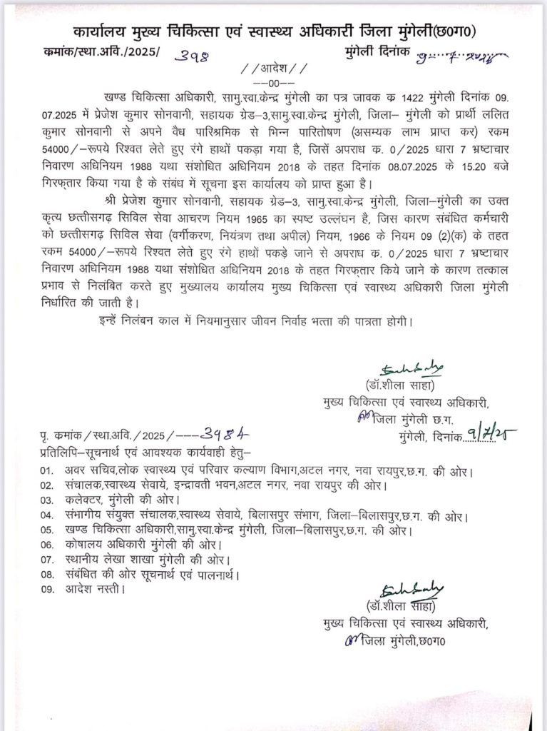 सत्या राजपूत, रायपुर। भ्रष्टाचार के खिलाफ आर्थिक अपराध अन्वेषण ब्यूरो (ACB) ने मंगलवार को बड़ी कार्रवाई करते हुए मुंगेली जिले में पदस्थ सहायक ग्रेड-3 कर्मचारी बृजेश कुमार सोनवानी को 54,000 रुपये की रिश्वत लेते हुए रंगे हाथों गिरफ्तार किया था। वहीं इस मामले की सूचना मिलते ही आज स्वास्थ्य विभाग हरकत में आया और एक्शन लेते हुए आरोपी बाबू को तत्काल प्रभाव से निलंबित कर दिया है। इस संबंध में जिला चिकित्सा एवं स्वास्थ्य अधिकारी, मुंगेली ने आदेश जारी किया है।