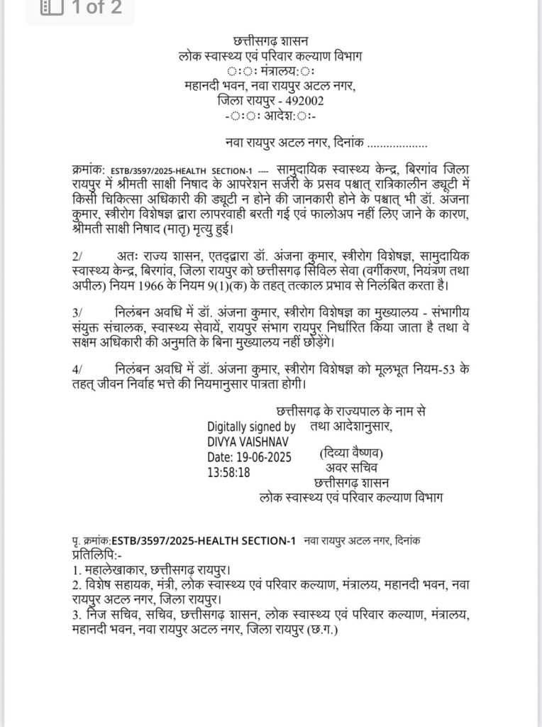 सत्या राजपूत, रायपुर। सामुदायिक स्वास्थ्य केंद्र (CHC) बीरगांव में प्रसव के बाद महिला मरीज की मौत के मामले में बड़ी प्रशासनिक कार्रवाई की गई है। लोक स्वास्थ्य एवं परिवार कल्याण विभाग, मंत्रालय द्वारा जारी आदेश के तहत स्त्री रोग विशेषज्ञ डॉक्टर अंजना कुमार को निलंबित कर दिया गया है।