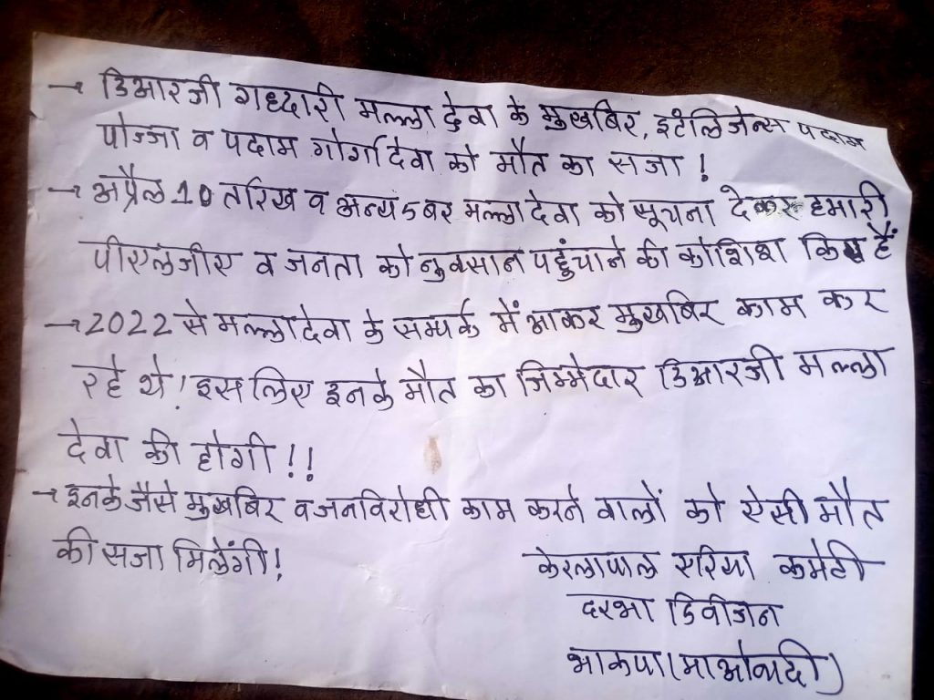 केरलापाल एरिया कमेटी दरभा डिविजन ने सिरसेटी में दो ग्रामीण की हत्या की जिम्मेदारी ली है. बाकायदा पर्ची जारी किया गया है, जिसमें पदाम पोज्जा और देवेंद्र उर्फ देवा पर साल 2022 से डीआरजी जवान के संपर्क में आने और मुखबिरी करने का आरोप लगाया है. इसी संदेही में मौत के घाट उतार दिया गया है.