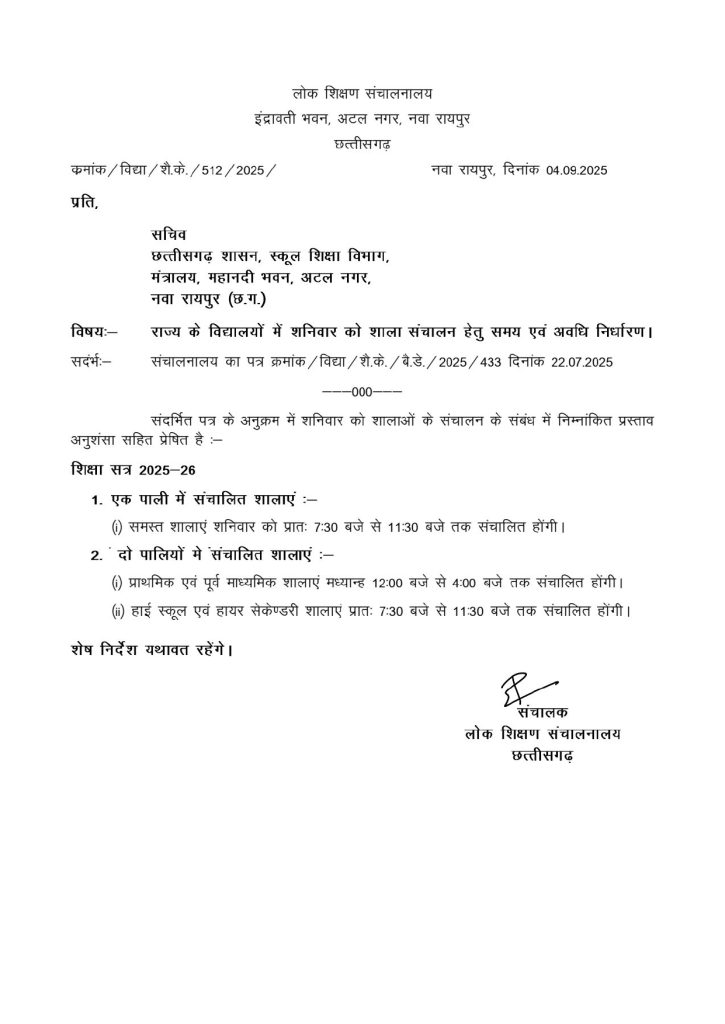 सत्या राजपूत, रायपुर. शिक्षकों की मांग के बाद शुक्रवार को लोक शिक्षण संचालनालय ने विद्यालयों के समय परिवर्तन का नया प्रस्ताव भेजा है. शिक्षा सचिव को भेजे गए प्रस्ताव में सुबह की पाली में स्कूल को संचालित करने की बात कही गई है.