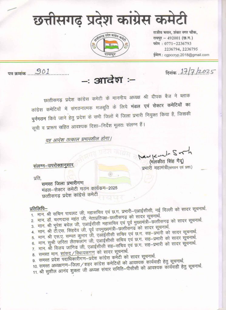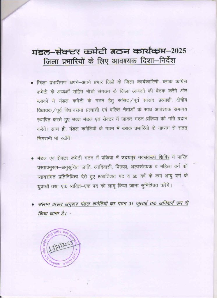 आदेश में यह भी बताया गया कि उदयपुर नवसंकल्प शिविर में पारित प्रस्ताव के अनुसार, इन कमेटियों में अनुसूचित जाति, जनजाति, पिछड़ा वर्ग, अल्पसंख्यक और महिला वर्ग को न्यायसंगत प्रतिनिधित्व देना अनिवार्य होगा. प्रत्येक कमेटी में 50 वर्ष से ऊपर और 50 वर्ष से कम आयु वर्ग के युवाओं में से एक-एक व्यक्ति को शामिल करना होगा. सभी अनुसूचित मंडल कमेटियों के गठन के लिए 31 जुलाई की तारिख तय की गई है.