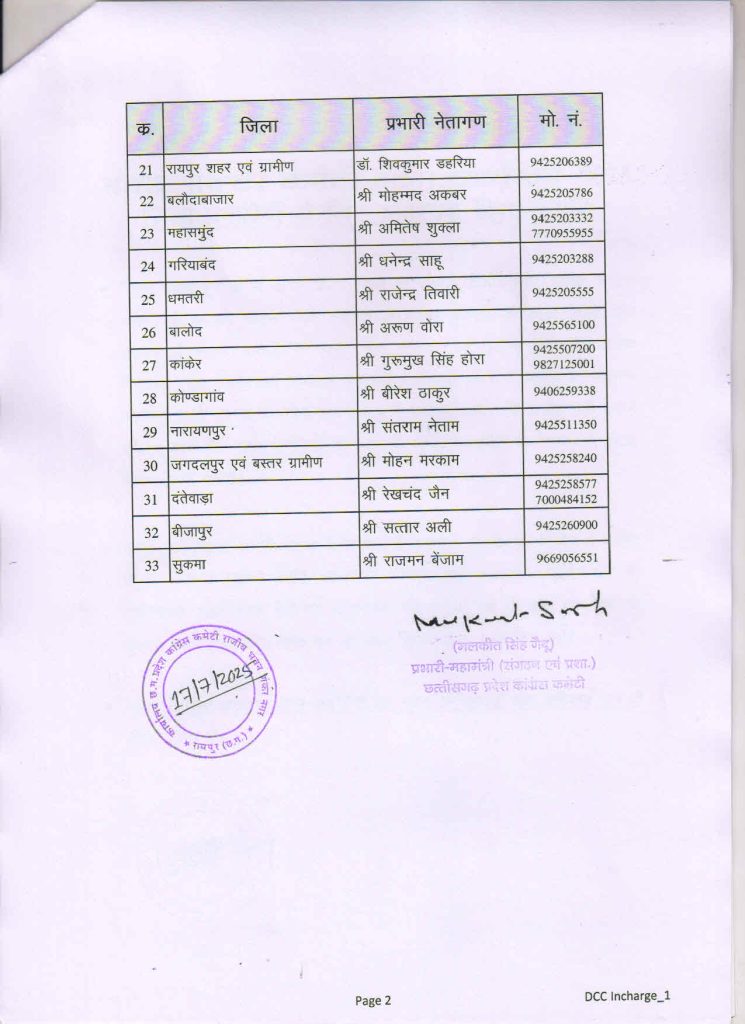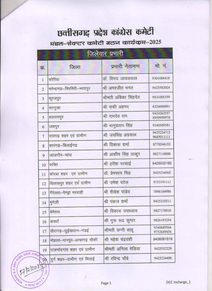 CG News : शिवम मिश्रा, रायपुर. कांग्रेस राष्ट्रीय अध्यक्ष मल्लिकार्जुन खड़गे के निर्देश के बाद अब पीसीसी चीफ दीपक बैज ने जिला प्रभारियों की नियुक्ति की है. मंडल और सेक्टर कमेटी के पुनर्गठन के लिए सभी 33 जिलों में नियुक्तियां की गई है. पूर्व मंत्री शिव डहरिया रायपुर शहर एंव ग्रामीण का प्रभारी बनाए गया है. पूर्व मंत्री मोहम्मद अकबर बलौदा बाजार, रविंद्र चौबे दुर्ग भिलाई, उमेश पटेल बिलासपुर, मोहन मरकाम जगदलपुर के प्रभारी बनाए गए हैं. इस संबंध में लिस्ट जारी की गई है.