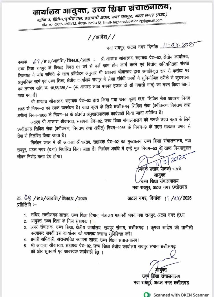 उच्च शिक्षा संचालनालय से जारी आदेश में कहा गया है कि एक वर्ष से वर्क फार्म होम कार्य करने एवं वित्तीय अनियमितता संबंधी शिकायत मिली थी. जांच समिति की रिपोर्ट अनुसार बाबू आकाश श्रीवास्तव ने अनाधिकृत रूप से कर्तव्य पर अनुपस्थित रहा और उच्च शिक्षा, क्षेत्रीय कार्यालय रायपुर में लेखा संबंधी कार्यों में सुनियोजित तरीके से कुटरचना कर लगभग 18,55,289 रुपए का गबन किया जाना पाया गया है. आकाश श्रीवास्तव, सहायक ग्रेड-02 का यह कृत्य छग सिविल सेवा आचरण नियम 1965 के नियम-3 का स्पष्ट उल्लंघन है. इसके चलते आकाश श्रीवास्तव, सहायक ग्रेड-02, उच्च शिक्षा संचालनालय को तत्काल प्रभाव से सेवा से निलंबित किया जाता है.