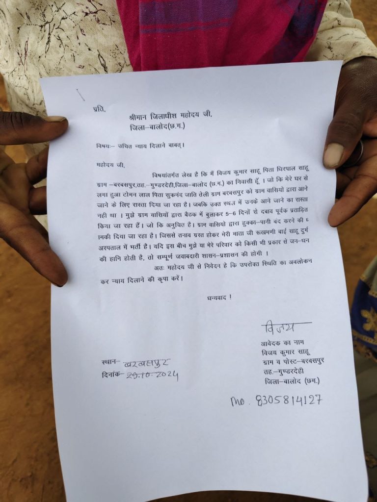 जानकारी के अनुसार, बरबसपुर निवासी विजय साहू अपने दो बच्चे और पत्नी के साथ कलेक्टर कार्यालय पहुंचा हुआ था, उसने बताया कि पिछले 10-12 सालों से जिस मकान में काबिज हैं, उसके एक हिस्से को तोड़ने के लिए गांव वालों द्वारा दबाव बनाया जा रहा है. पीड़ित ने आरोप यह भी लगाया कि गांव के लोग मीटिंग कर गांव से बहिष्कृत करने दबाव बना रहे हैं. इससे प्रताड़ित होकर वह अपने साथ जहर का डिब्बा लेकर आया हुआ था, जिसे डीएसपी राजेश बागड़े द्वारा पॉइजन को कब्जे में ले पीड़ित दंपति को न्याय का दिलाने कि बात कही गई और दंपति को घर भेजा गया.