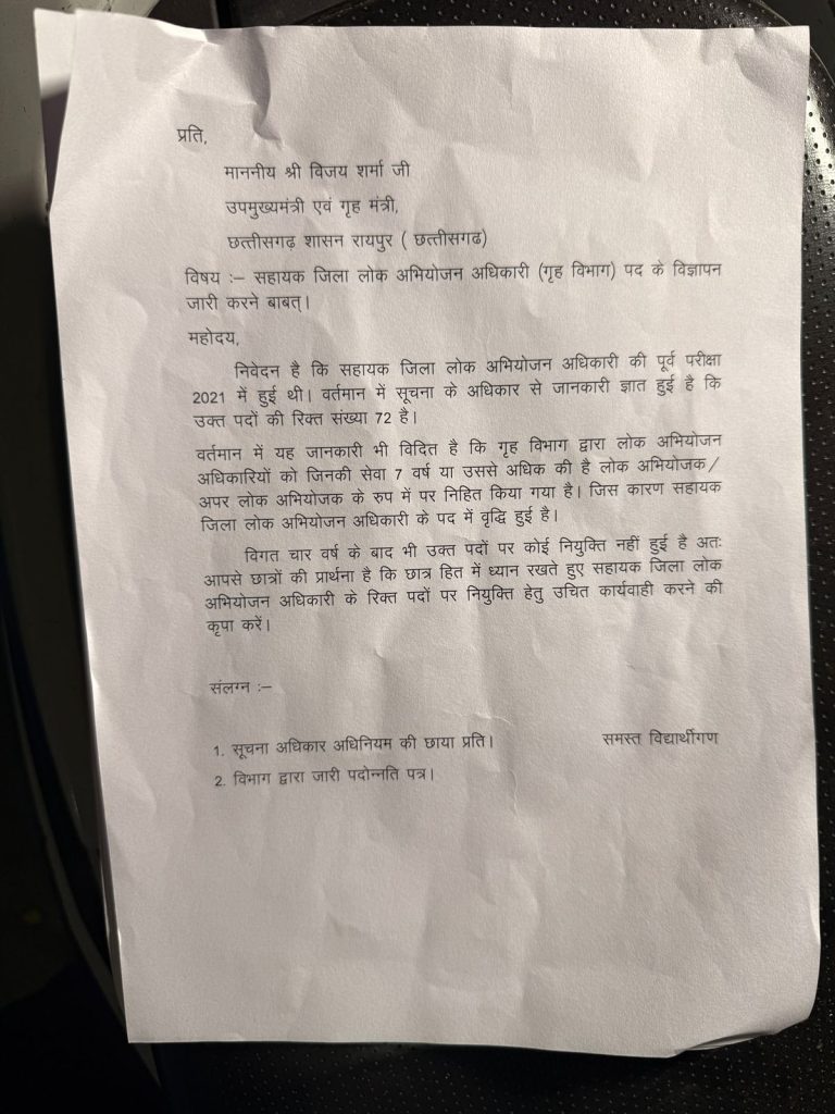 नितिन नामदेव, रायपुर. सहायक जिला लोक अभियोजन अधिकारी (ADPPO) पद के विज्ञापन जारी करने को लेकर अभ्यर्थियों ने गृह मंत्री विजय शर्मा को ज्ञापन सौंपा है. अभ्यर्थियों ने बताया कि इन पदों के लिए प्रारंभिक परीक्षा वर्ष 2021 में आयोजित की गई थी, लेकिन अब तक नियुक्ति प्रक्रिया शुरू नहीं हो सकी है.