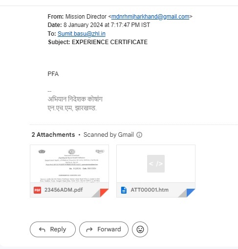 गौर करने वाली बात ये भी है कि ये ई-मेल शाम 7 बजकर 17 मिनट को भेजा गया है. अब ये छत्तीसगढ़ पुलिस और झारखंड एनएचएम के लिए जांच का विषय है कि उक्त अनुभव प्रमाण पत्र में कितनी सच्चाई है.