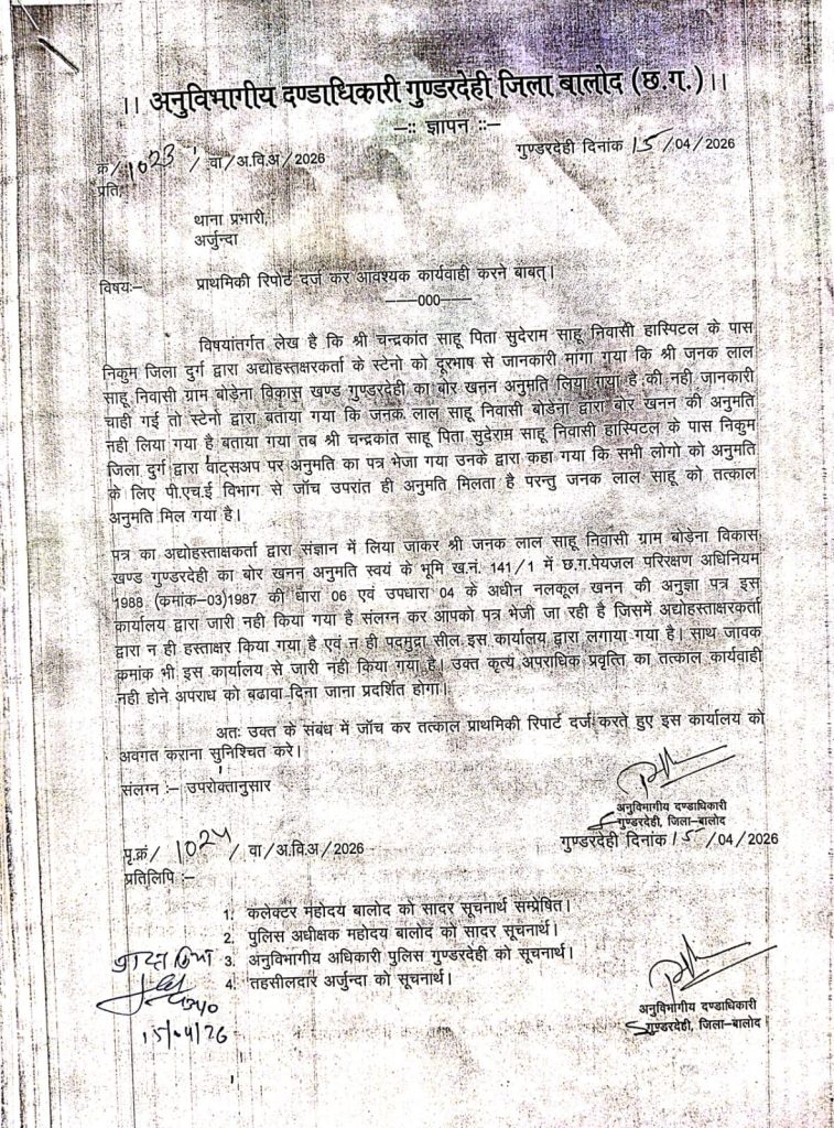 CG News : लक्ष्मीकांत बंसोड़, बालोद. बालोद जिले के गुंडरदेही क्षेत्र में बोर खनन को लेकर फर्जी दस्तावेज तैयार करने का मामला सामने आया है. गुंडरदेही एसडीएम के नाम से एक फर्जी लेटर तैयार किया गया, जिसमें शासकीय कार्यालय की फर्जी सील, हस्ताक्षर और आवक-जावक क्रमांक तक अंकित किया गया था, ताकि दस्तावेज असली प्रतीत हो. फर्जी दस्तवेज सामने आने के बाद प्रशासनिक महकमें में हड़कंप मच गया है.