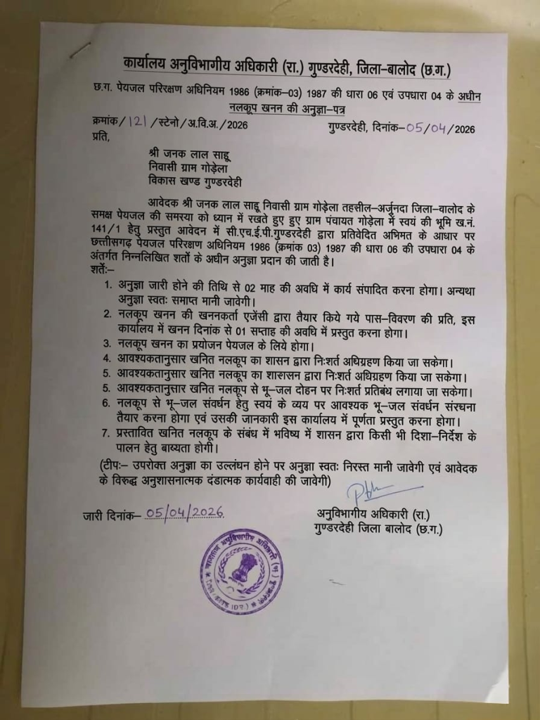 जानकारी के मुताबिक, ग्राम गोड़ेला निवाली जनक लाल साहू ने यह फर्जी लेटर तैयार किया है. मामला सामने आने के बाद एसडीएम गुंडरदेही द्वारा जनक लाल साहू के खिलाफ थाने में मामला दर्ज कराने का आदेश दे दिया है। ज्ञात हो कि शासन द्वारा बिना अनुमति किसी भी तरह के बोर खनन पर प्रतिबंध लगा दिया गया है। बहुत आवश्यक होने पर एसडीएम कार्यालय से अनुमति प्राप्त की जा सकती है, लेकिन इसके पूर्व विभाग द्वारा जांच कर ली जाती है कि सचमुच में बोर की आवश्यकता है या नहीं अर्थात बहुत कठिनता से यह अनुमति पत्र जारी होता है। जनक लाल साहू ने पांच अप्रैल की तारीख में यह अनुमति पत्र देकर बोर खनन कराया है।