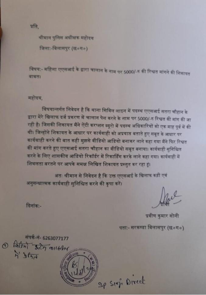 वीरेंद्र गहवई. छत्तीसगढ़ पुलिस की एक महिला एएसआई का वीडियो वायरल हो रहा है. इस वीडियो में वे थाने के बाहर समझौता हुए केस का चालान पेश करने के एवज में कथित रूप से 5 हजार रुपए मांगते हुए देखी और सुनी जा सकती है. लल्लूराम डॉट कॉम इस वायरल वीडियो की पुष्टि नहीं करता है, लेकिन इसी वीडियो के आधार पर प्रार्थी प्रवीण सोनी नाम के व्यक्ति ने बिलासपुर एसपी और एंटी करप्शन ब्यूरो से इसकी शिकायत की है.