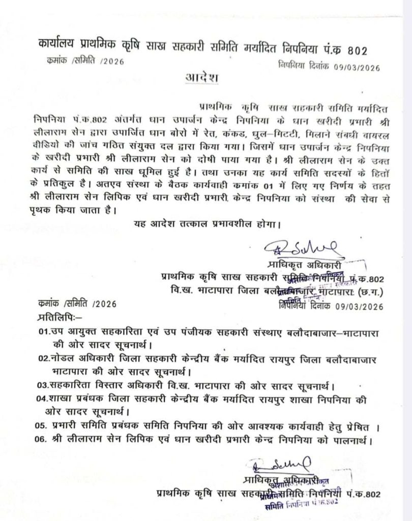 बलौदाबाजार। धान में रेत मिलाकर व्यक्तिगत लाभ के नीयत से हेराफेरी कर गबन करने के मामले में जिला प्रशासन ने कड़ी कार्रवाई करते हुए खरीदी केंद्र प्रभारी को बर्खास्त कर दिया है। प्राप्त जानकारी के अनुसार प्राथमिक कृषि साख सहकारी समिति मर्यादित निपनिया के धान उपार्जन केन्द्र निपनिया में उपार्जित धान के बोरों में रेत, कंकड़ धूल-मिट्टी मिलाने संबंधी वायरल वीडियो की जांच कर संयुक्त जांच दल ने 8 मार्च को प्रतिवेदन प्रस्तुत किया था। जांच में धान उपार्जन केन्द्र निपनिया के भौतिक सत्यापन में 137.20 क्विंटल धान अधिक पाया गया था।