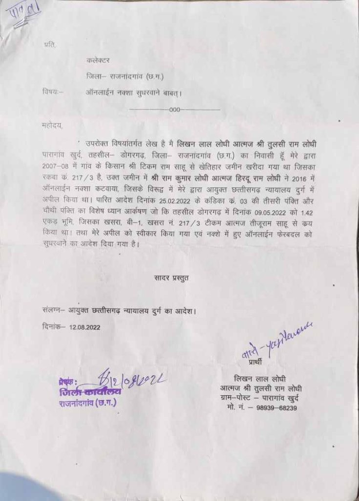 लिखन लाल का कहना है कि वे वर्षों से न्याय के लिए तहसील से लेकर आयुक्त और राजस्व मंडल तक भटक रहे हैं और कई जगह से उनके पक्ष में आदेश भी मिले हैं। इसके बावजूद उन्हें जमीन पर न्याय नहीं मिल पाया। अनुविभागीय दंडाधिकारी (एसडीएम) डोंगरगढ़ ने भी अपने आदेश में विवादित जमीन पर लिखन लाल का कब्जा माना और दूसरे पक्ष को हस्तक्षेप से रोका था। साथ ही फसल लौटाने के निर्देश दिए थे, लेकिन इन आदेशों का जमीनी स्तर पर कोई असर नहीं दिख रहा। आरोप है कि हर साल उनकी फसल जबरन काट ली जाती है और विरोध करने पर धमकी दी जाती है।