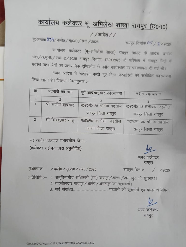 लेकिन करीब 1.30 महीने तक उन्होंने आरंग में पोस्टिंग नहीं दी. अब एक बार फिर उनका ट्रांसफर आरंग से रायपुर के उसी पटवारी हल्का में हो गया जहां वे वर्षों से पदस्थ थे, यानी सिर्फ कागजों में ही उनका ट्रांसफर यहां से वहां होता रहा वो भी बिना सर्विस ब्रेक के.