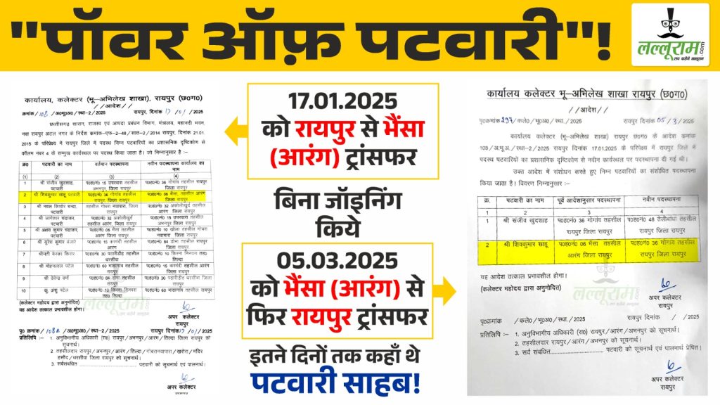 CG News: प्रतीक चौहान. अब इसे एक टैलेंट कहे या जुगाड़ का जैक… ये तो तय आप ही किजिएगा, लेकिन शासकीय कर्मचारी ये कह रहे है कि ट्रांसफर-पोस्टिंग का ये कैल्कुलेशन कैसे हुए ये हमे भी सिखना है. हुआ कुछ यूं है कि कुछ महीनों पहले रायपुर कलेक्टर के अनुमोदन के बाद राजधानी रायपुर में वर्षों से जमे पटवारियों का तबादला हुआ.