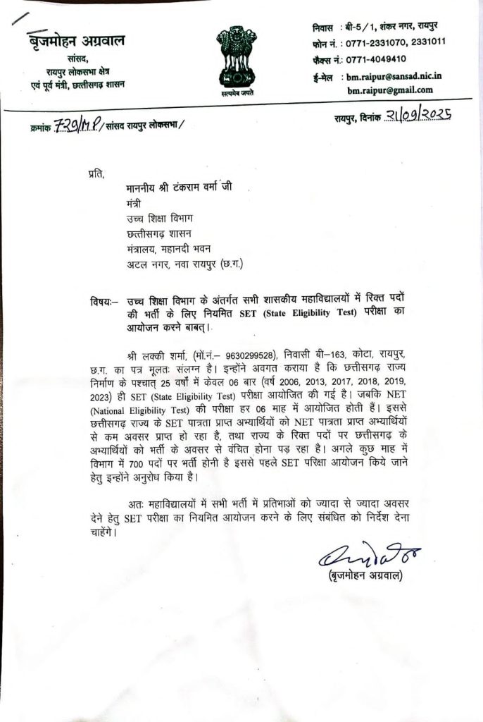 CG News : रायपुर. रायपुर सांसद बृजमोहन अग्रवाल ने उच्च शिक्षा मंत्री टंक राम वर्मा को पत्र लिखा है. इसमें उन्होंने SET परीक्षा को नियमित कराने की मांग की है. ताकि महाविधायालयों में रिक्त पदों की भर्ती में युवाओं को अधिक से अधिक अवसर मिल सके.