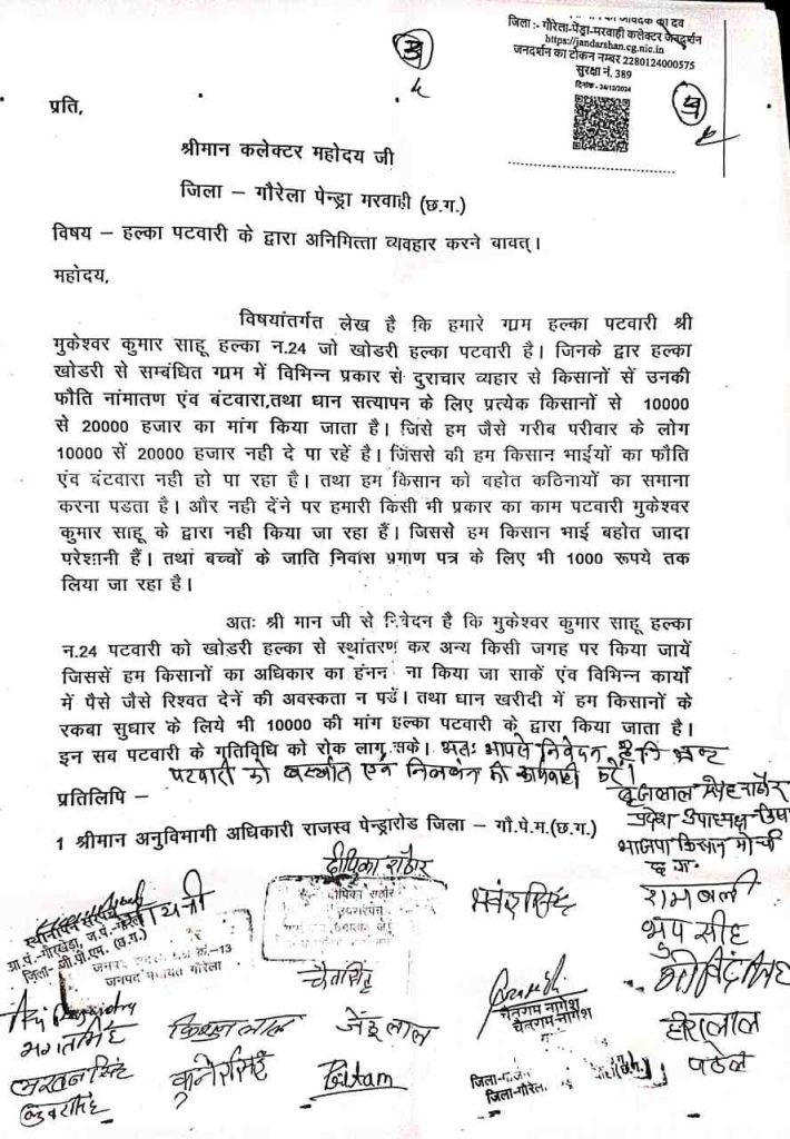 पटवारी के इस हरकतों को लेकर किसानों ने कलेक्टर गौरेला पेंड्रा मरवाही के पास भी शिकायत दर्ज कराई है. किसानों ने पटवारी को हटाने और बर्खास्त करने की मांग की है. बताया जा रहा है कि पटवारी मुकेश्वर साहू ने 10 से 15 किसानों से पैसे लेकर धान का सत्यापन किया है.