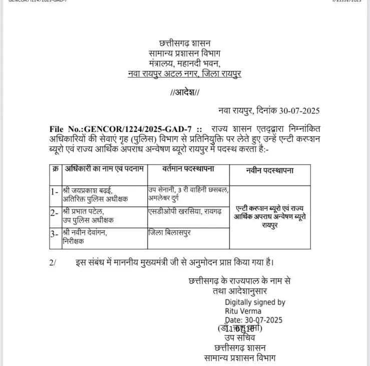 रायपुर. राज्य सरकार ने ASP, DSP और TI का तबादला आदेश जारी किया है. गृह (पुलिस) विभाग के अधिकारियों को प्रतिनियुक्ति पर लेकर उनकी पदस्थापना एंटी करप्शन ब्यूरो एवं राज्य आर्थिक अपराध अनवेषण ब्यूरो रायपुर में की गई है. इसका आदेश सामान्य प्रशासन विभाग ने आज जारी किया है. ASP जयप्रकाश बढ़ई, डीएसपी प्रभात पटेल समेत इंस्पेक्टर नवीन देवांगन को ACB-EOW में भेजा गया है.