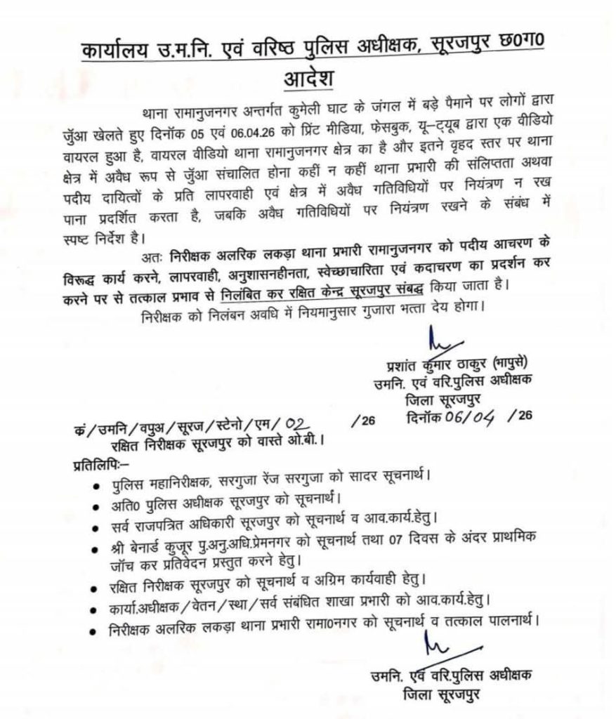 दिलशाद अहमद, सूरजपुर। काम में लापरवाही बरतने पर एसपी प्रशांत ठाकुर ने रामानुजनगर थाना प्रभारी अलरिक लकड़ा और आरक्षक पंकज सिंह को निलंबित कर दिया है। आदेश में कहा गया है कि सोशल मीडिया में जुआ खेलते लोगों का वीडियो वायरल हुआ था। यह वीडियो रामानुजनगर थाना क्षेत्र के कुमेली जंगल का बताया जा रहा था। इतने वृहद स्तर पर थाना क्षेत्र में अवैध रूप से जुआ संचालित होना कहीं न कहीं थाना प्रभारी की संलिप्तता अथवा पदीय दायित्वों के प्रति लापरवाही एवं क्षेत्र में अवैध गतिविधियों पर नियंत्रण न रख पाना प्रदर्शित करता है।