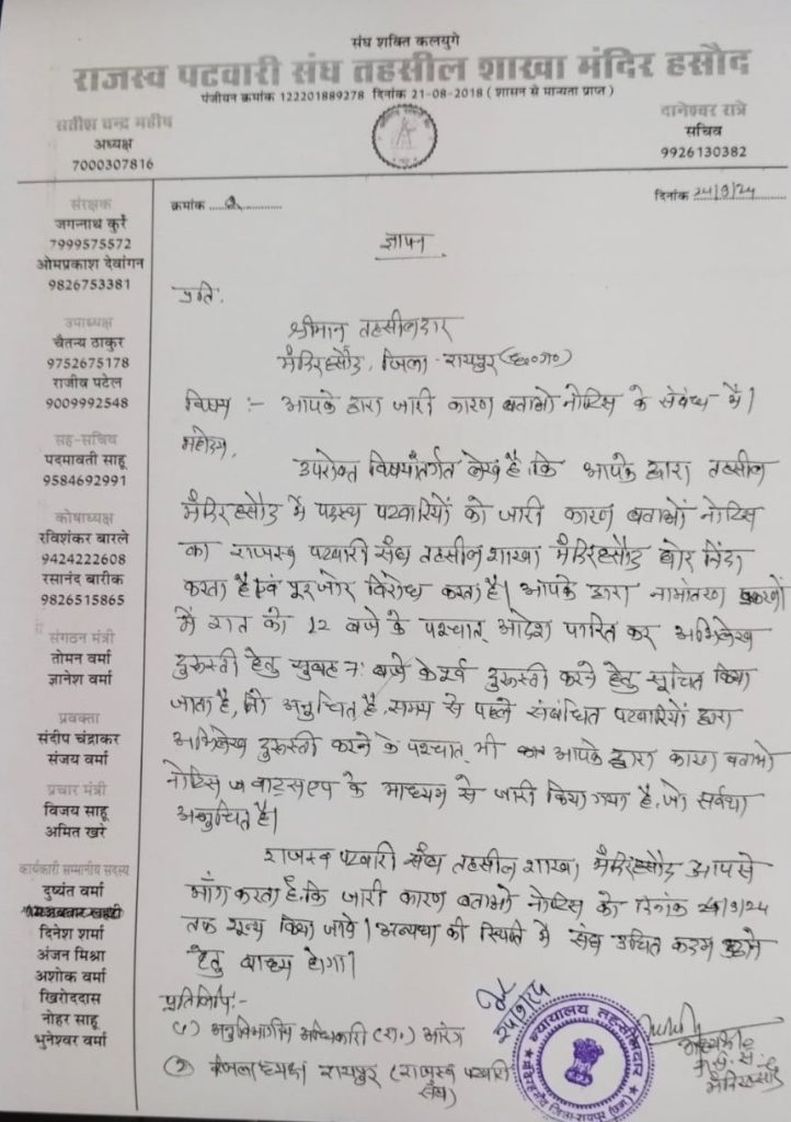 इस पत्र में दावा किया गया है कि तहसीलदार रात 12 बजे के बाद आदेश पारित कर अभिलेख दुरूस्ती हेतु सुबह 7 बजे के पहले तक का वक्त दिया जाता है. संघ के इस पत्र में दावा किया गया है कि कारण बताओ नोटिस वाट्सअप के माध्यम से जारी किया गया है. इस संबंध में तहसीलदार राजकुमार साहू से उनका पक्ष लेने उन्हें फोन किया गया, लेकिन उन्होंने फोन का जवाब नहीं दिया.