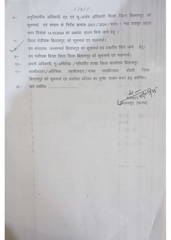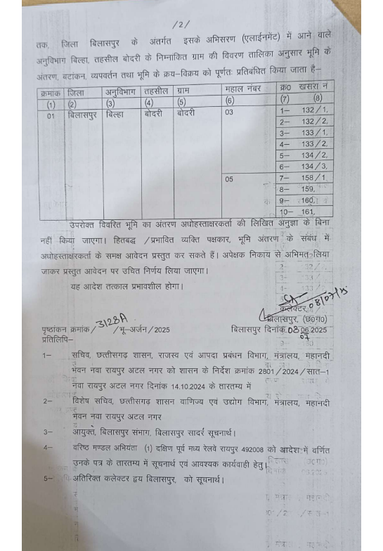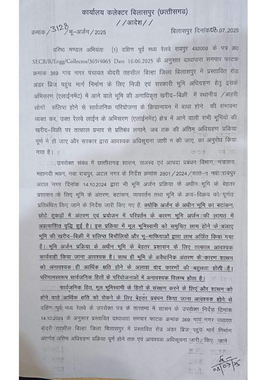 बिलासपुर | छत्तीसगढ़ के बिलासपुर जिले में प्रस्तावित रेलवे प्रोजेक्ट को लेकर जिला प्रशासन ने एक बड़ा फैसला लिया है. जमीन अधिग्रहण की प्रक्रिया पूरी होने तक गांव की सभी संबंधित जमीनों पर क्रय-विक्रय, रजिस्ट्री और नामांतरण (म्यूटेशन) पर तत्काल प्रभाव से रोक लगा दी गई है.