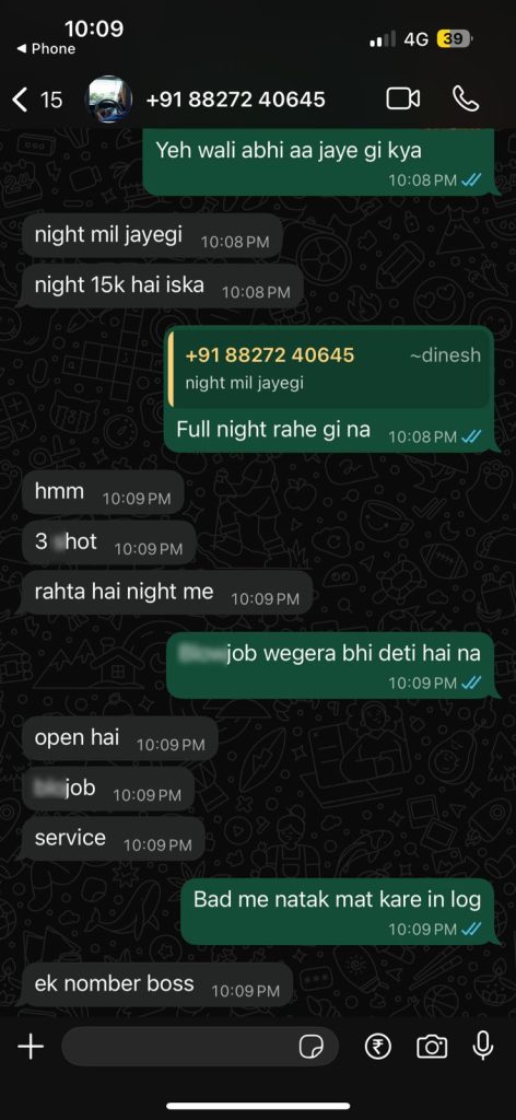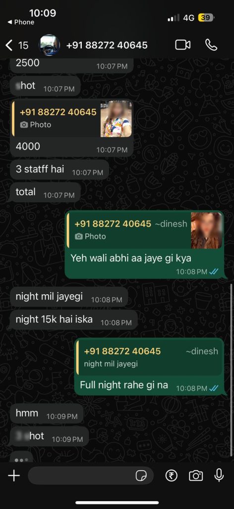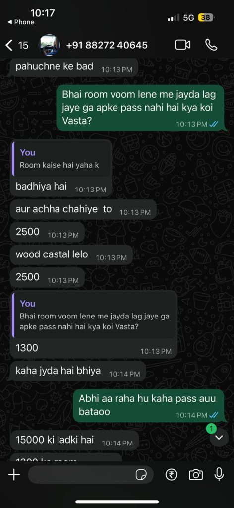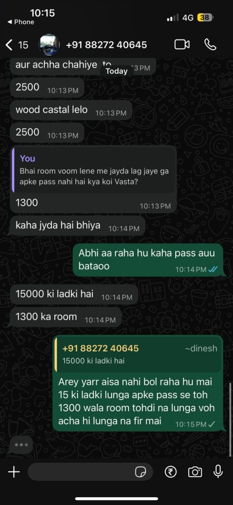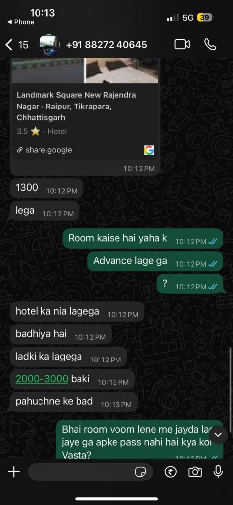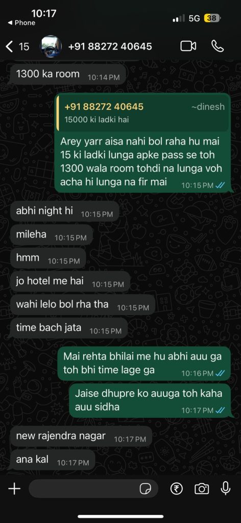 वाट्सअप चैट में लड़कियों की अश्लील तस्वीरें और न्यू राजेंद्र नगर के होटल में रूम बुक करने को लेकर बातचीत है. ये न्यू राजेंद्र नगर थाना पुलिस के लिए जांच का विषय है कि उक्त मोबाइल नंबर में क्या-क्या बातचीत हुई. उक्त नंबर पर लल्लूराम डॉट कॉम ने फोन भी किया तो फोन मैनेजर ने उठाया और पेट्रोल पंप में पुलिस के साथ होने की जानकारी भी दी.